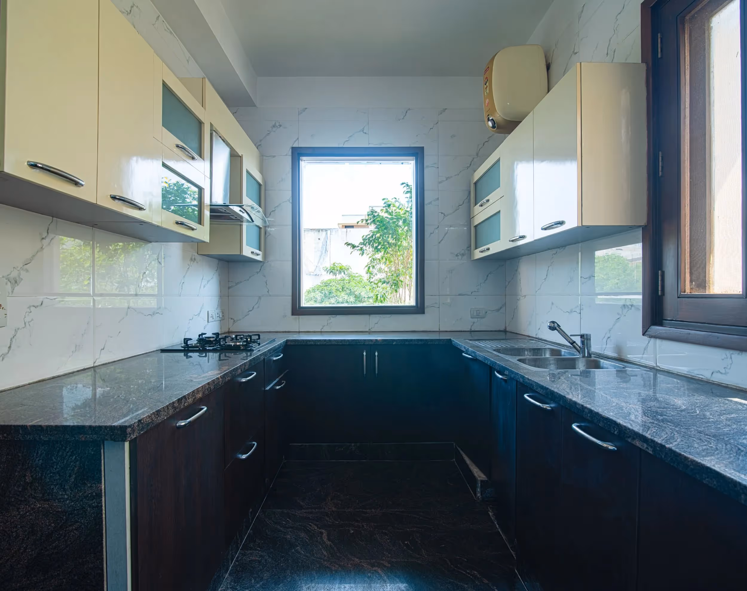 There is a fully equipped kitchen on each floor of the property. Hence, this is really a hybrid property option. So if you are a family and need ample space then you can book the 3 Bedroom Service Apartment on Sohna Road. This is ideal, or you can book an independent room in the property and then have access to the kitchen or use the services of the in-house chef and FnB Services.