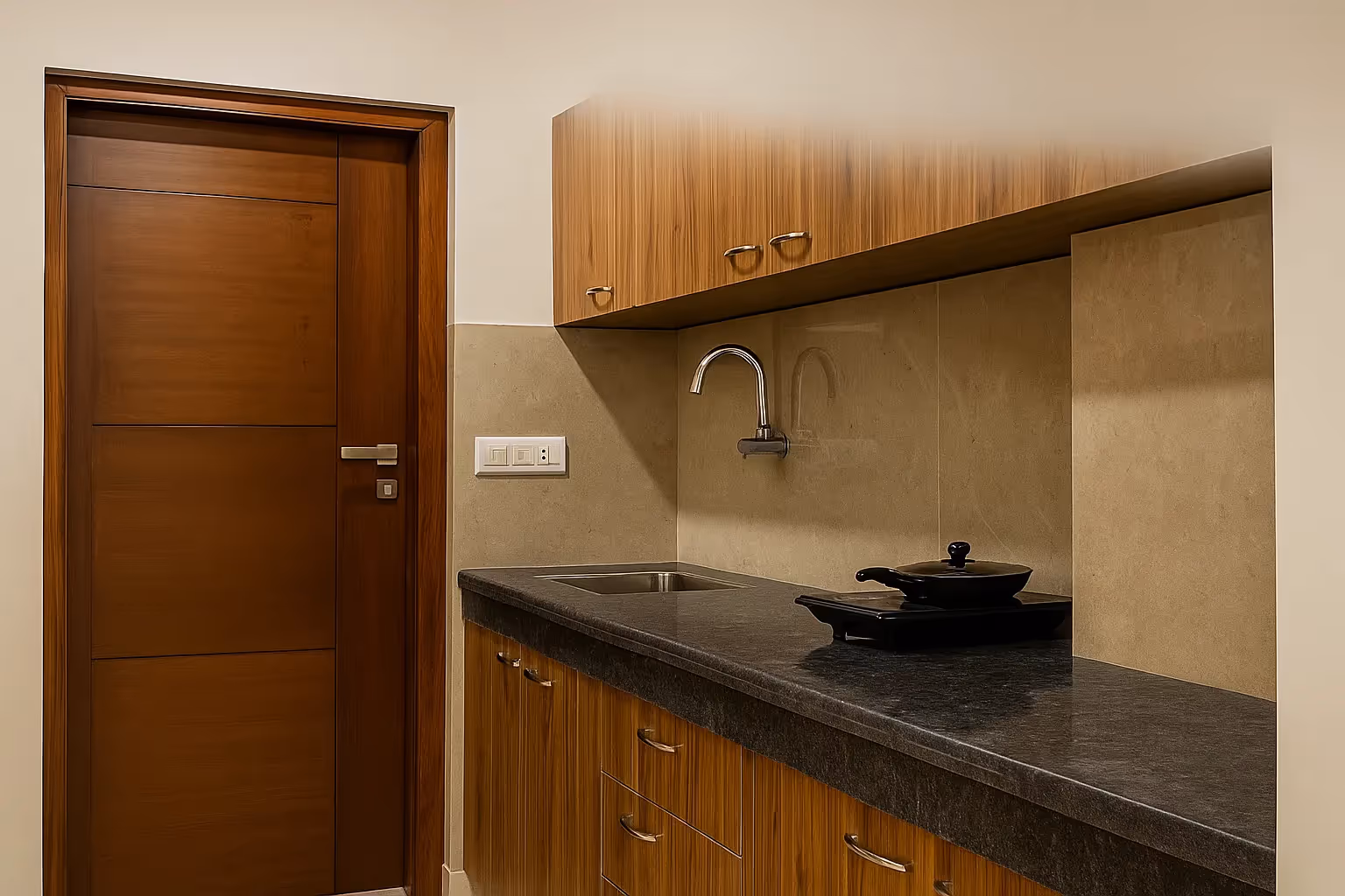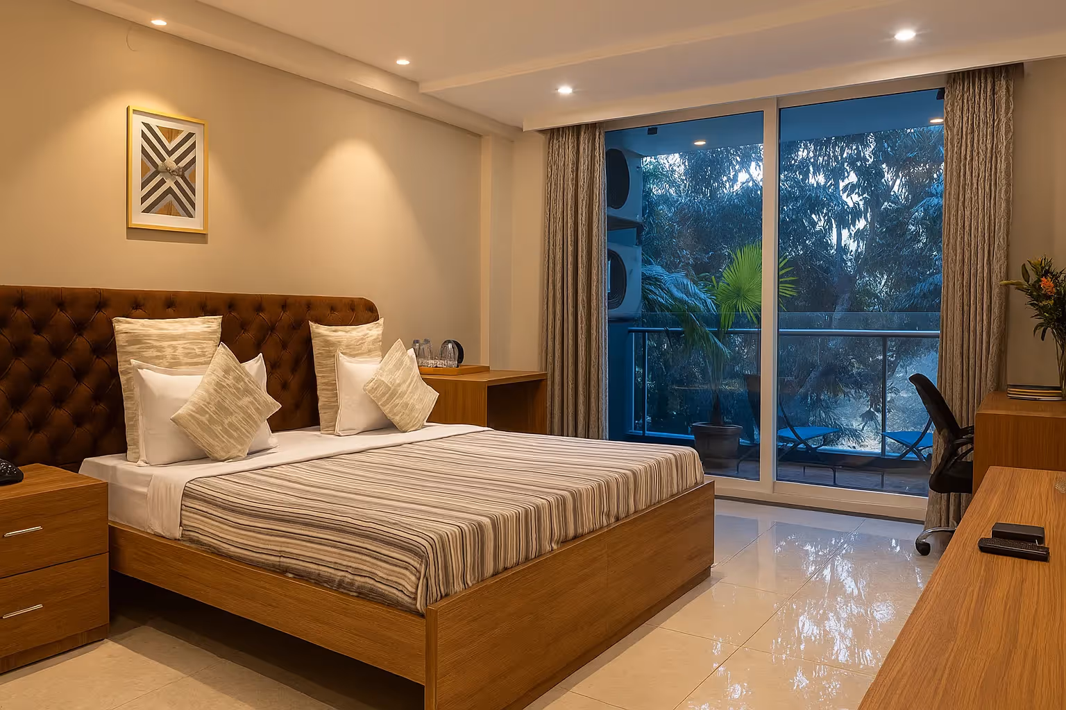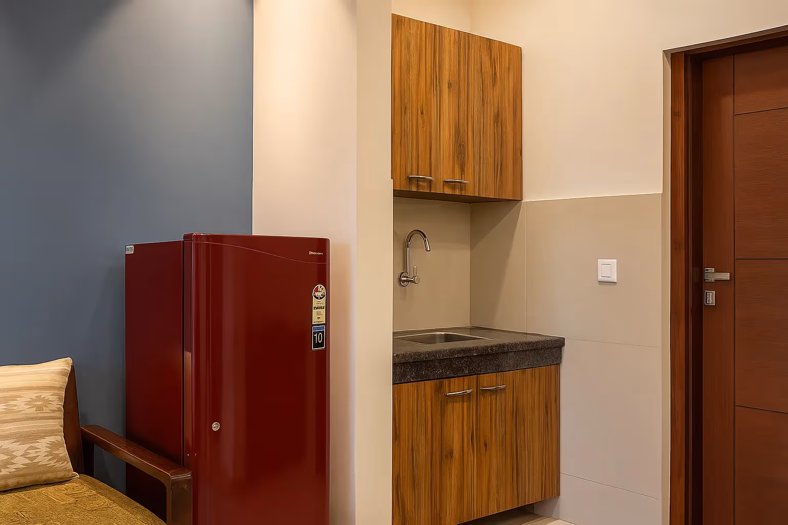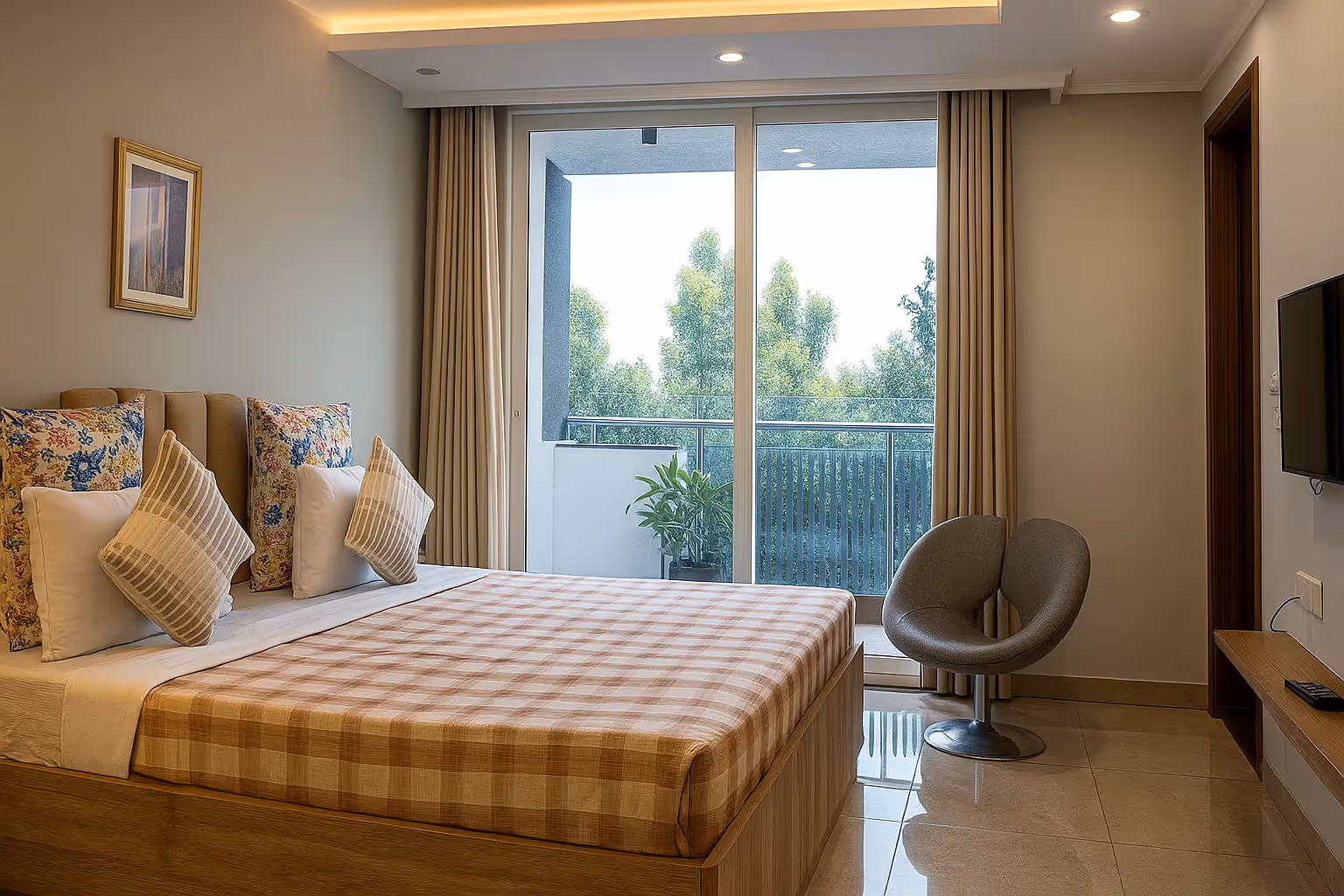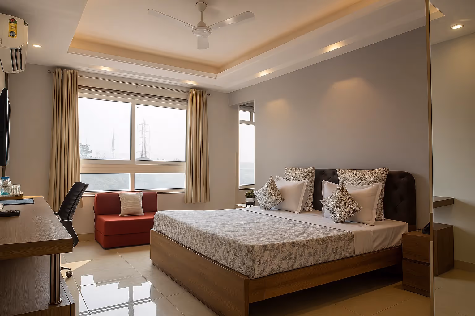Perch MG Road is a premium serviced apartment in Gurgaon, offering Studios for short or long term stay. It is a 3 side open property with green views. It has a ground-floor breakfast and dining lounge, and TT play area. At the front, you’re greeted with a soothing park view, while the rear opens up to a green expanse of the Gurgaon skyline. A 5 min walk to MG Road Metro Station.