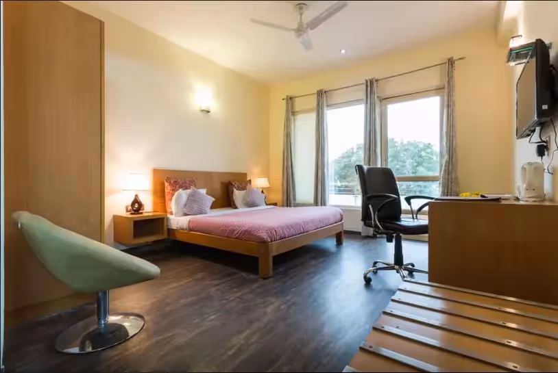 Large sized Studio with en-suite bathroom & Kitchenette. The room is ideal for short to long duration stays in Gurgaon and is well furnished. Rooms on the upper floors have balconies that overlook the rear plot (which has green cover and trees). Rooms have plenty of natural light and are airy.