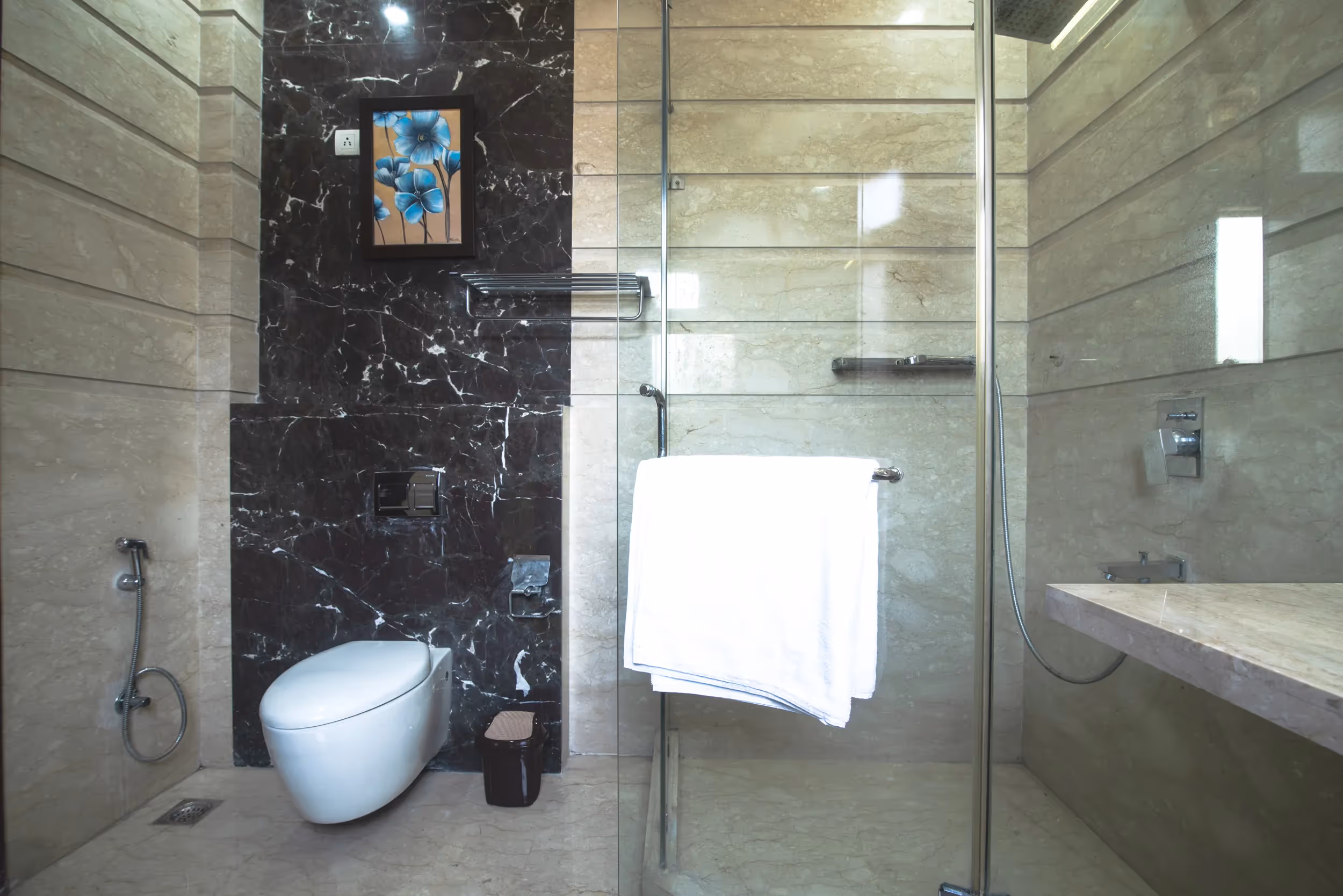 Large sized luxury sterling rooms with ensuite bathroom. The room is ideal for short to long duration stays and is well furnished. The bathroom is modern with large beds, study table and sofa. All sterling rooms have balconies and ground floor sterling room has a pvt living room as well. Rooms have plenty of natural light and are airy and each has 42 inch LED Tvs with Tata Sky Dish Cable Tv. Size: 350 sq ft (Bedroom + Bathroom + Balcony), Ideal for couples, families single travellers and corporates, Accommodates 2 people + 1 extra bed